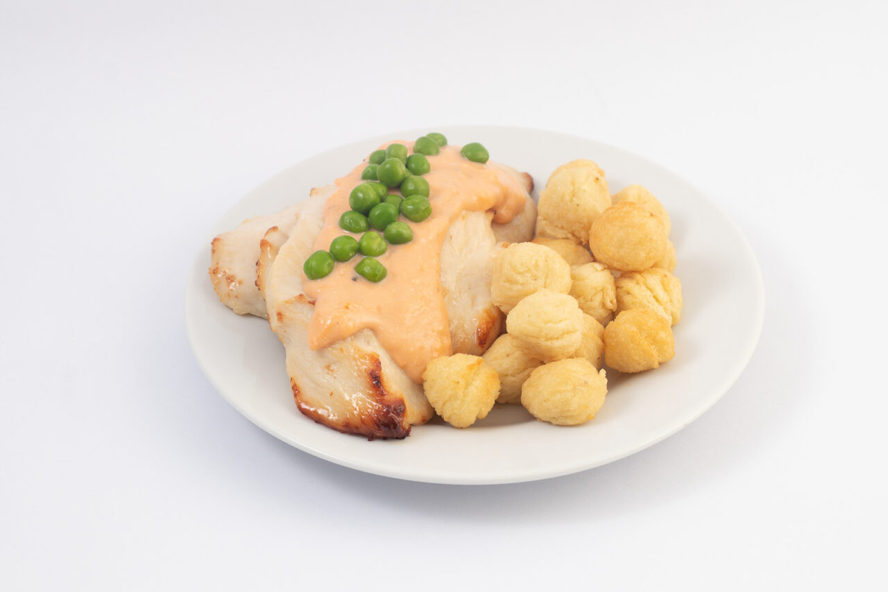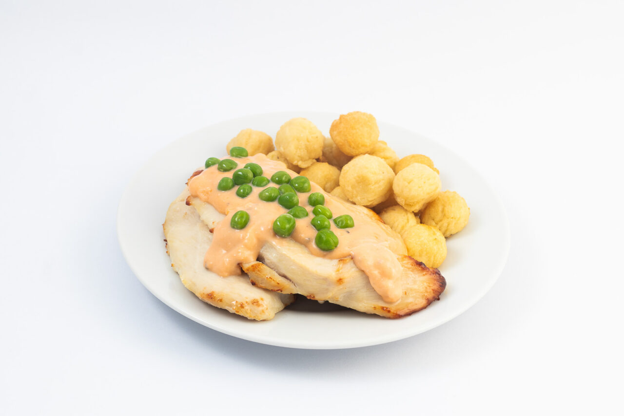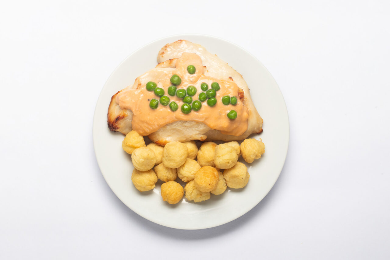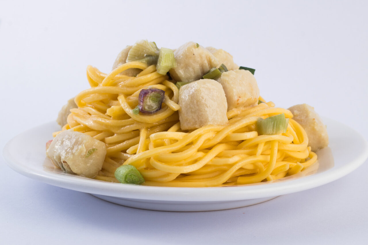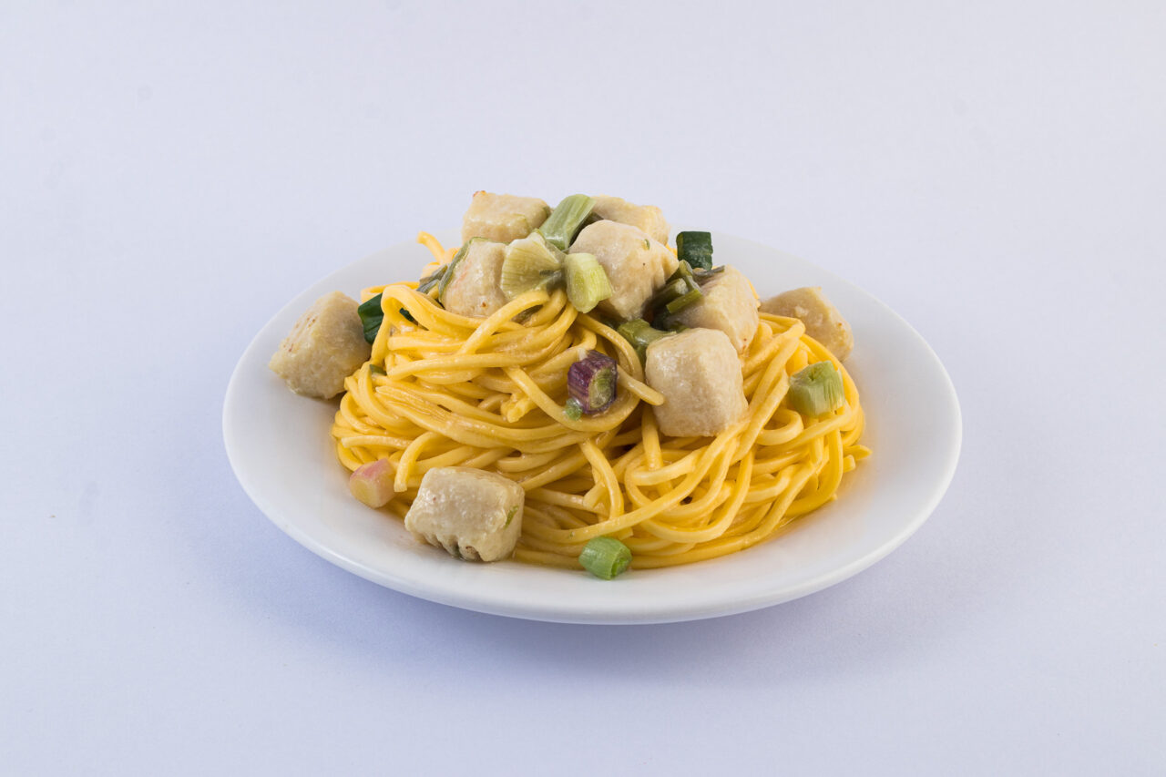 – Tallarines con salsa de verdeo y cubos de pollo.