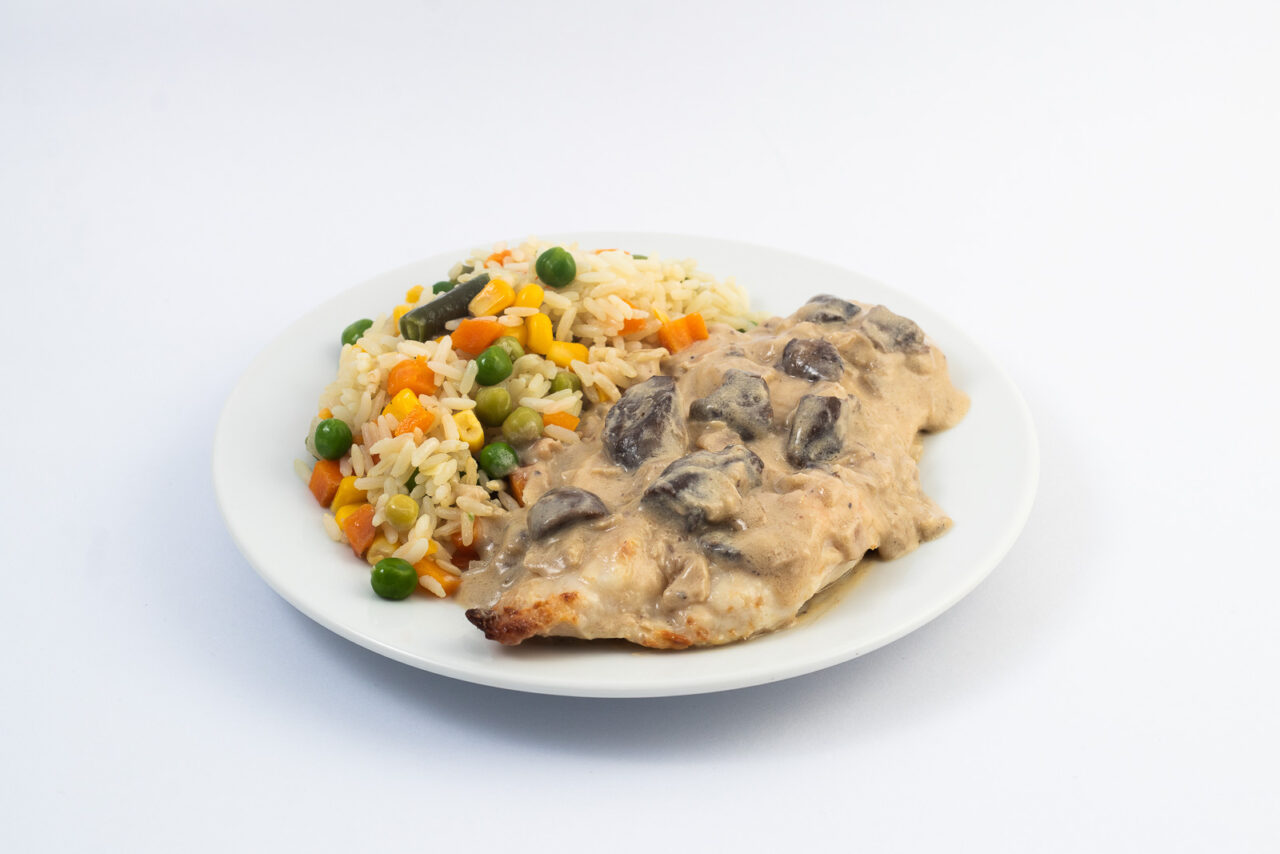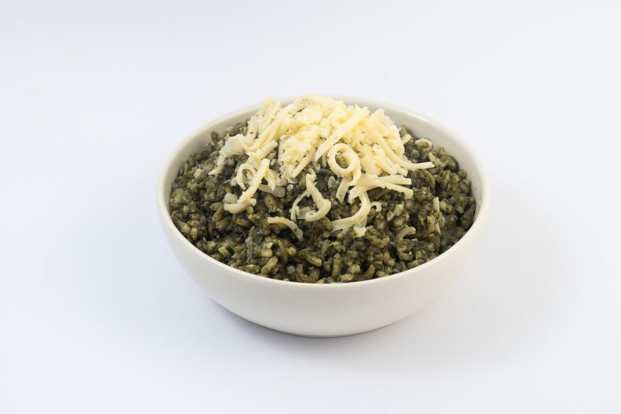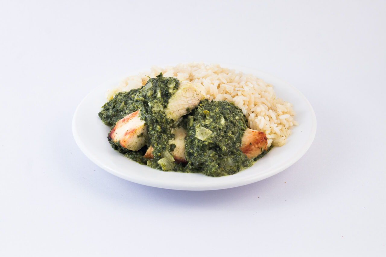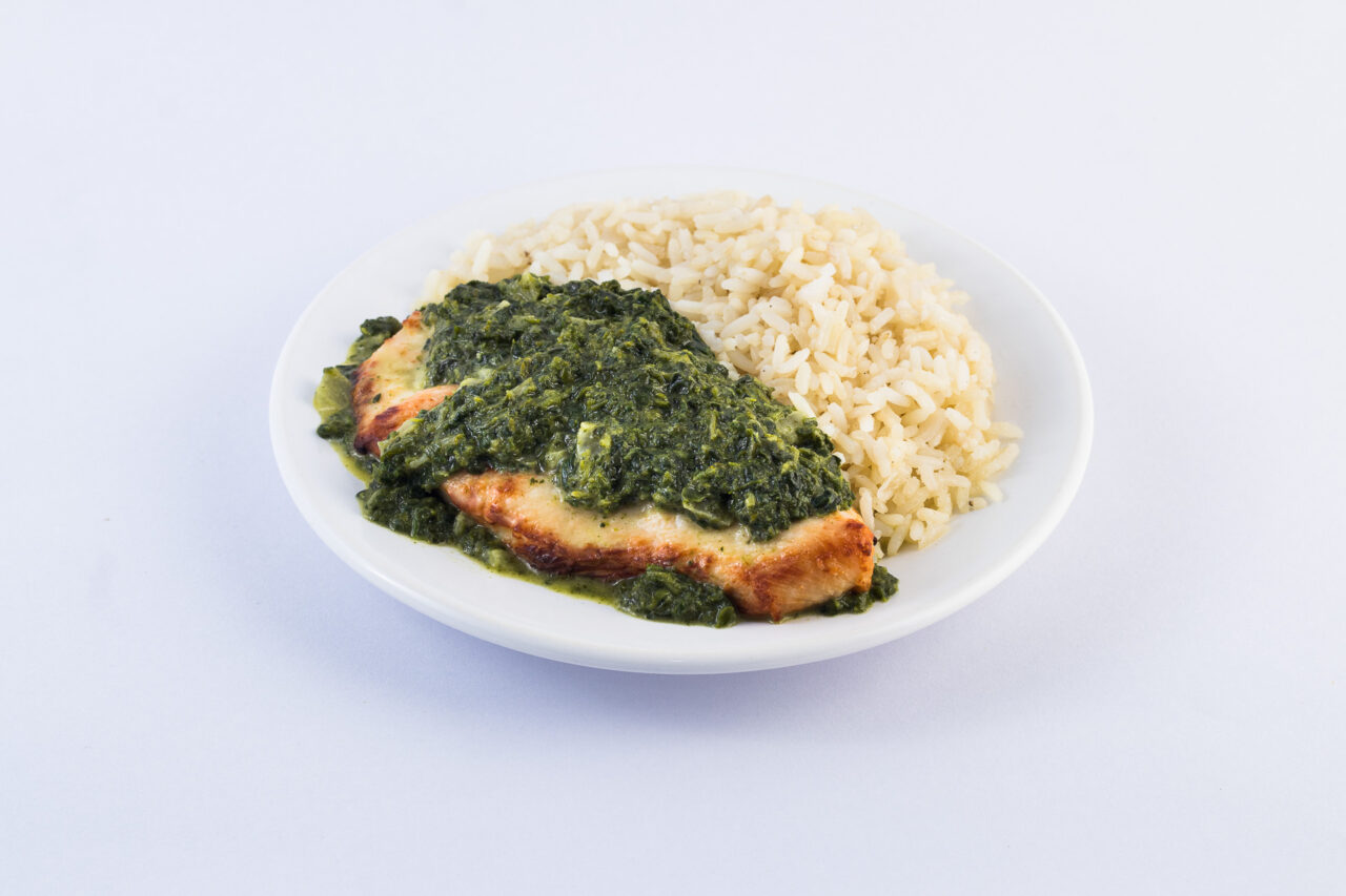 – Tallarines con salsa de verdeo y cubos de pollo.