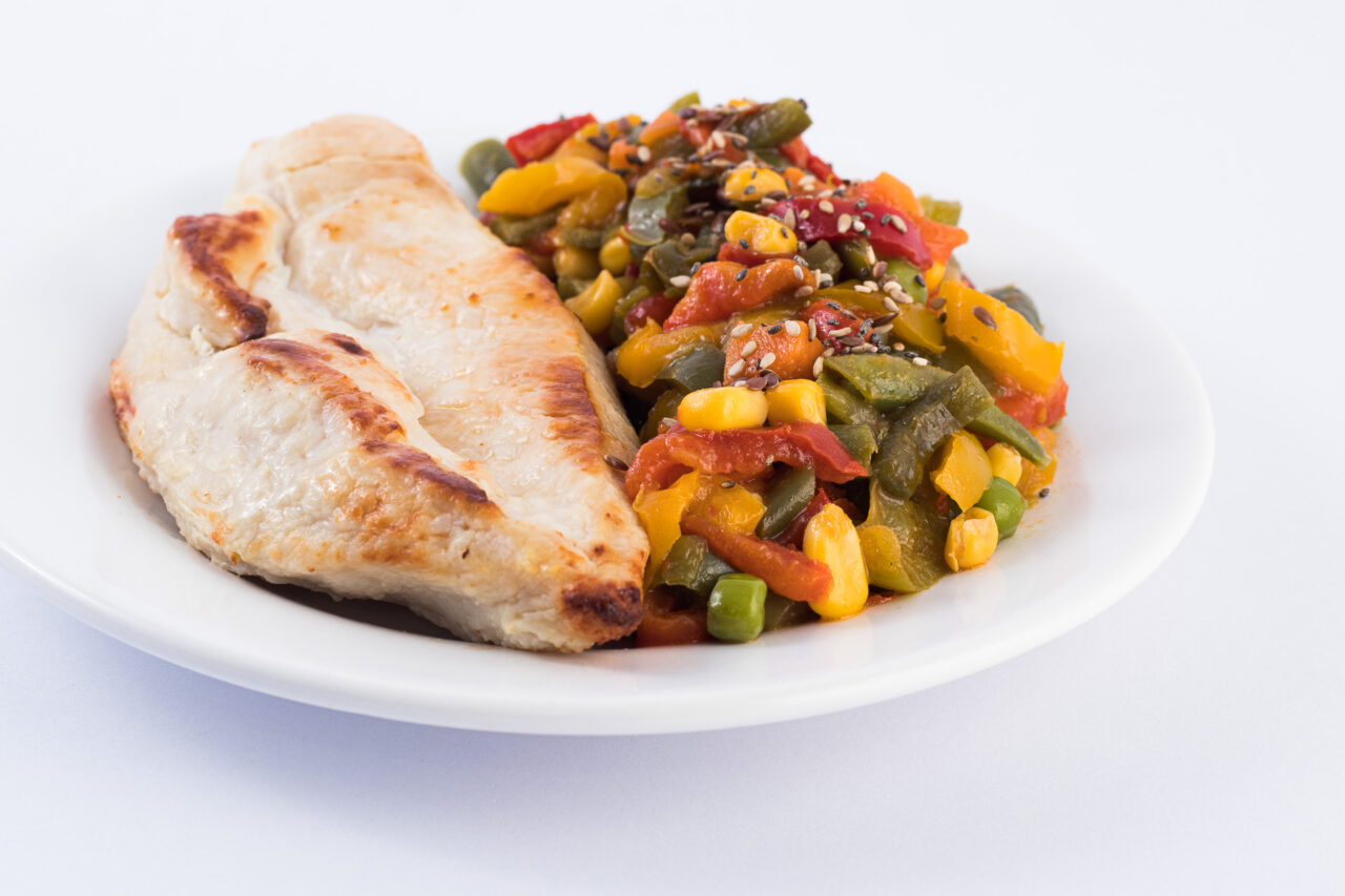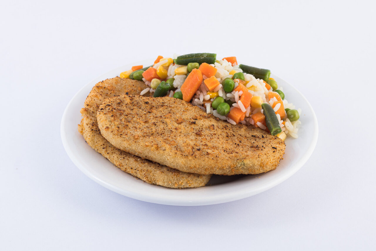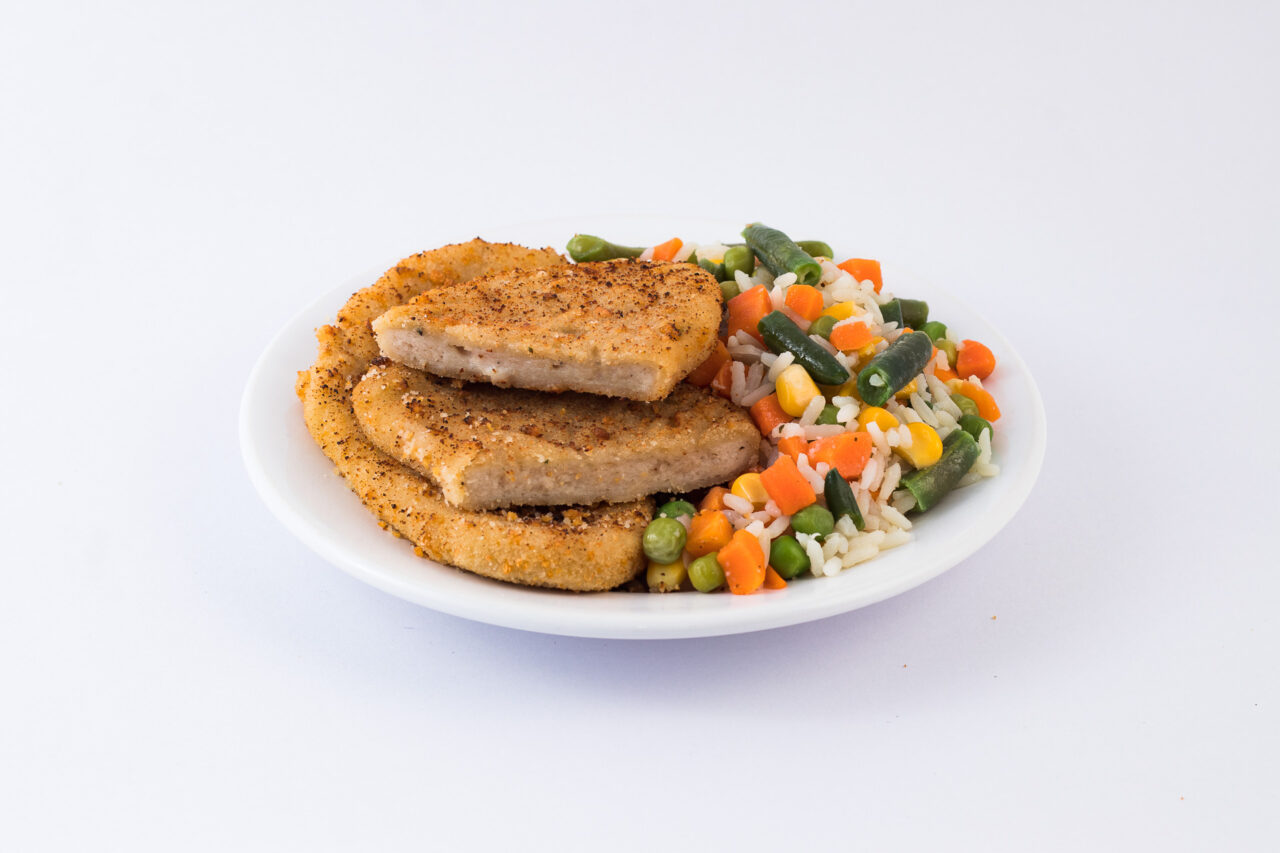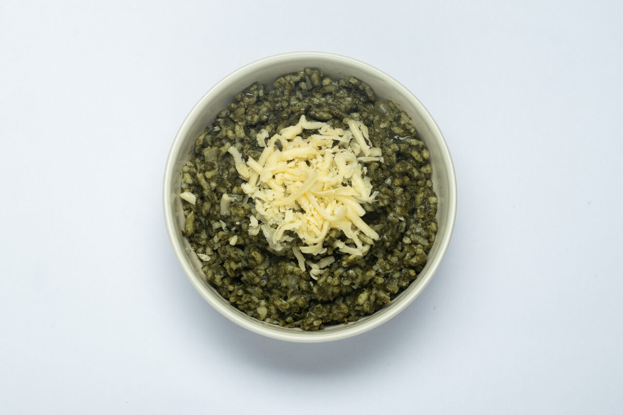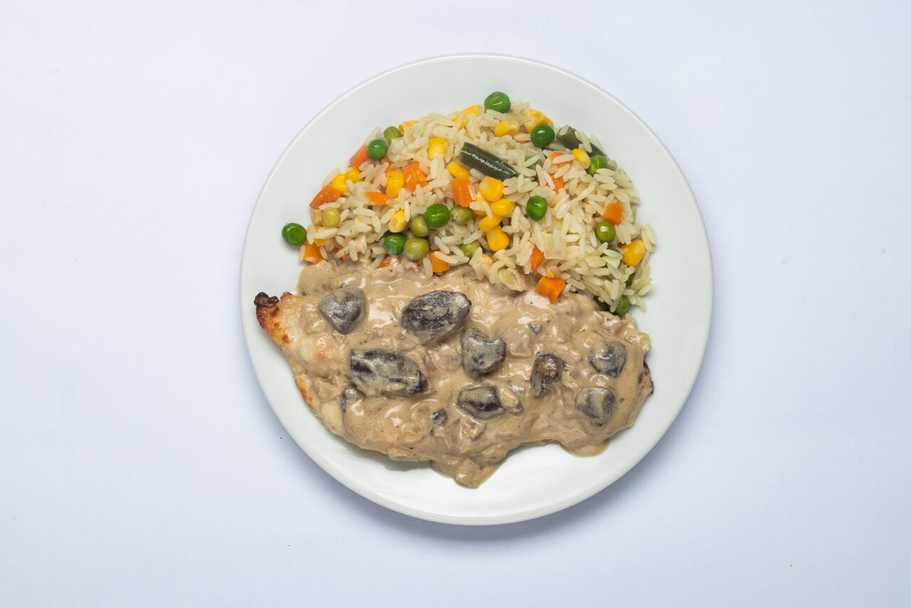 – Tallarines con salsa de verdeo y cubos de pollo.