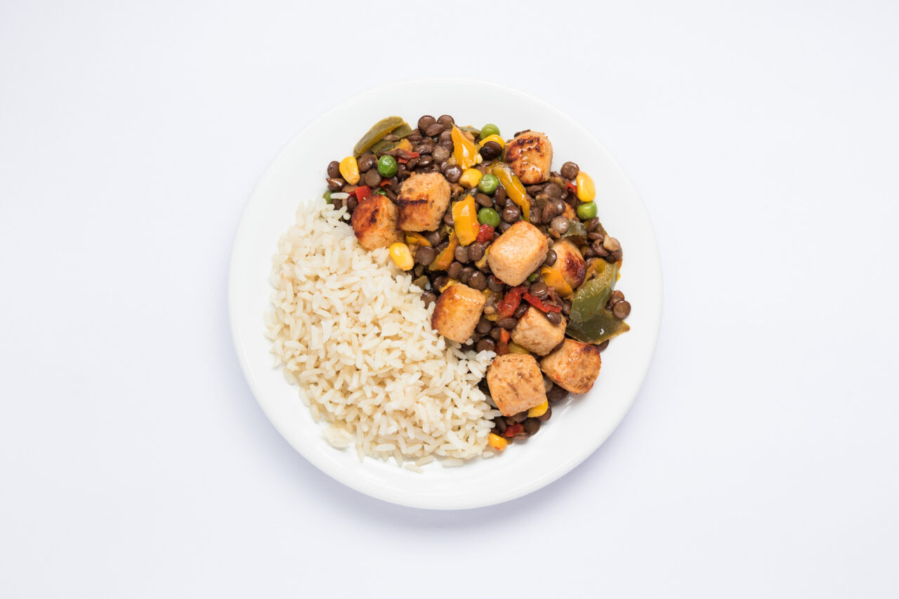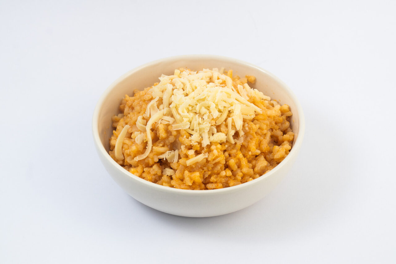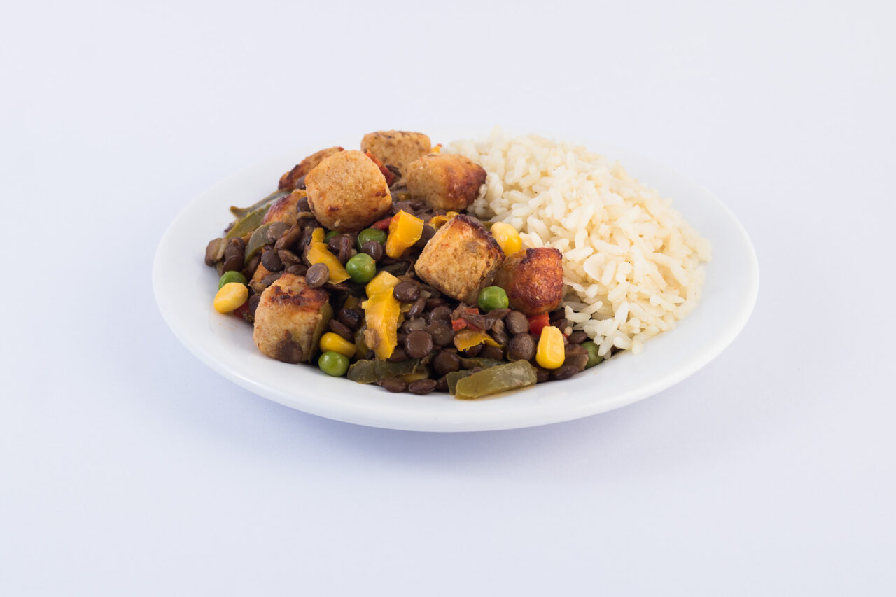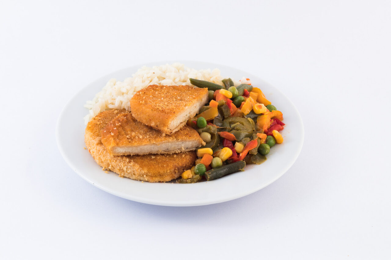 – Tallarines con salsa de verdeo y cubos de pollo.